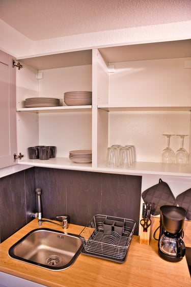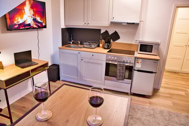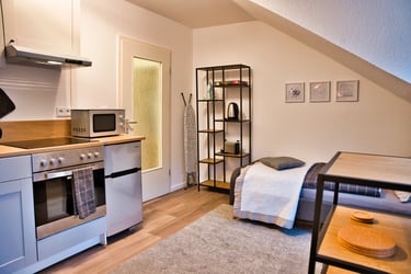 Neben einer vollausgestatteten Küchenzeile, die keine Wünsche offen lässt, bieten wir ein Bett mit einer Federkernmatratze (90x200). Auf Wunsch lässt sich das Apartment durch ein weiteres Bett auch für zwei Personen herrichten.